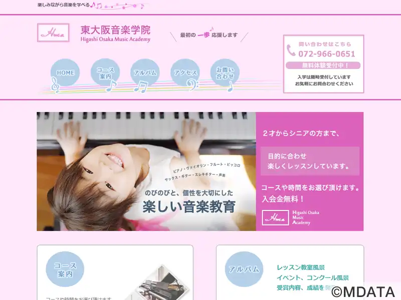 東大阪市の近鉄花園駅から徒歩約5分に位置する音楽教室で、ピアノ、ヴァイオリン、フルート、サックス、ギターなど多岐にわたるコースを開講している。楽典やソルフェージュなどの基礎トレーニングも行う。初級から上級まで一人一人に合わせ、楽しみながら音楽を学べるカリキュラムで丁寧な指導を行なっている。また、レッスンの時間や曜日は生徒の都合に合わせて柔軟に設定可能で、幅広い年齢層と経験レベルの人々に対応している。