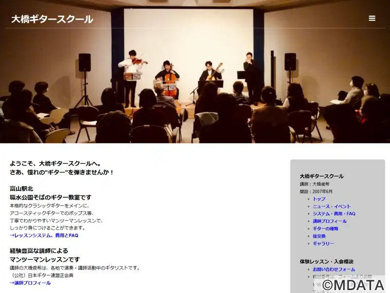 富山駅北、環水公園の近くにあるギター教室。本格的なクラシックギターをメインに、中学生以上の希望者にはアコースティックギターの指導も行っている。クラシックとアコースティックの併行受講も可能。生徒に合わせた教材・カリキュラムを用い、丁寧で分かりやすい個人レッスンを提供。オンラインレッスンも可能。(社)日本ギター連盟正会員のギタリスト大橋俊希氏が主宰。2007年6月に開設。