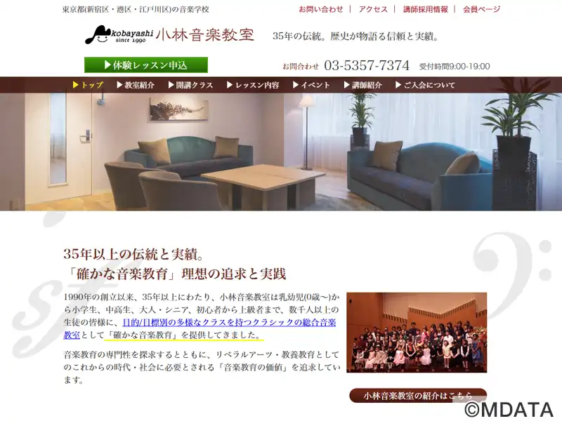 0歳から大人まで学べる総合音楽教室。2004年にオープンした船越教室、全クラスを開講する新宿教室(2015年)、麻布教室(2017年移転)、代々木教室(2019年)の4つの教室を展開し、いずれも感性豊かなレッスン環境と機能性、クラシック音楽の確固たる基礎に基づいた質の高いレッスンを提供。ピアノ、ソルフェージュ、作曲、ヴァイオリン、声楽、絶対音感クラス、コンクールや音楽学校受験にも対応。