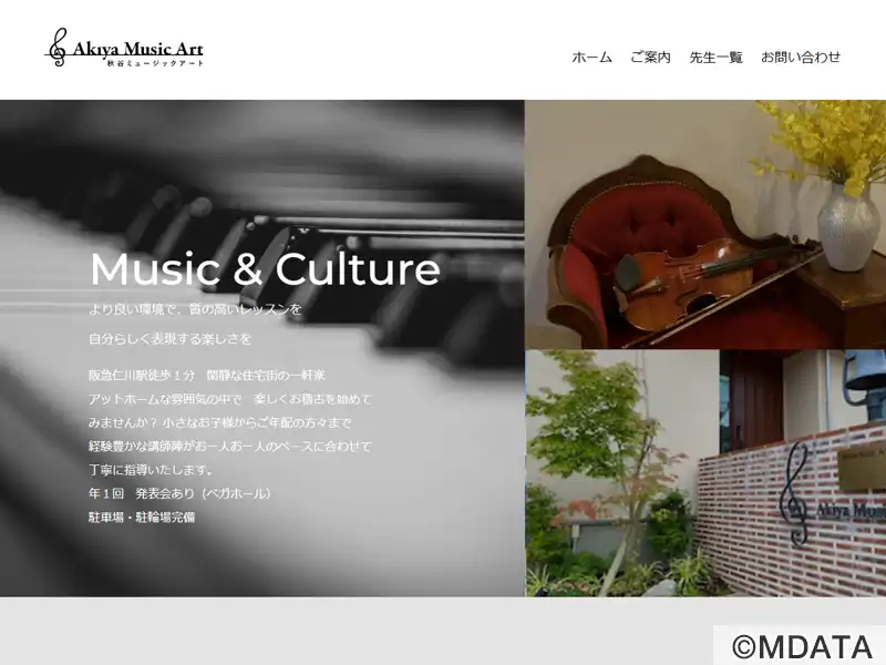 兵庫県宝塚市の阪急仁川駅から徒歩2分にある音楽教室。5つのレッスンルームで、ピアノ、バイオリン、フルート、クラリネット、ランペット、サクソフォン、ジャズギター、ウッドベース、声楽など、多彩な楽器とジャンルのレッスンを開講。初心者から音楽大学を目指す人まで、小マンツーマンで基礎を重視した指導を行う。音楽大学出身やコンクール受賞歴を持つ講師が、個々のレベルや個性に合わせた丁寧なレッスンを提供している。