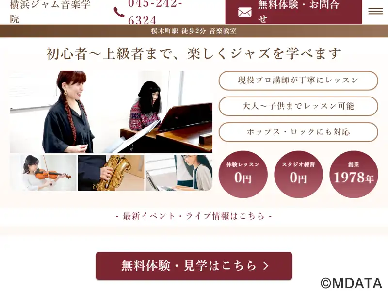 横浜市桜木町駅から徒歩2分の場所にある老舗音楽教室。1978年、横浜で初めてのポピュラー&ジャズスクールとして開講。初心者から上級者まで幅広く対応し、ジャズを中心にポップスやロックなど多様な音楽ジャンルを学べる。全14種の楽器に対応。スタジオや豊富な教材を揃え、講師は現役のプロミュージシャンで、演奏技術の向上をサポートしている。定期的にイベントやライブも開催され、仲間と共に音楽を楽しむことができる。