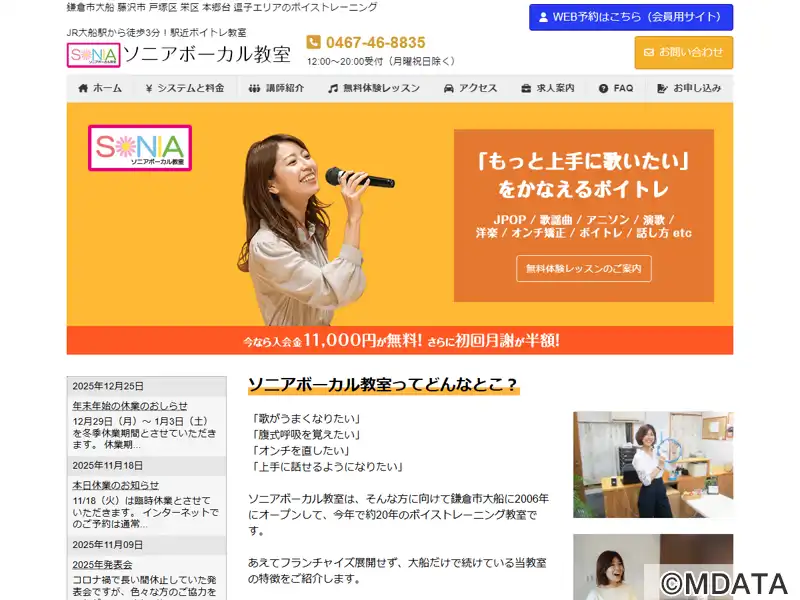 鎌倉市の大船駅近くにあるボーカルスクール。基礎からボイストレーニングが学べ、腹式呼吸やノドを開けた発声法のマスターに重点を置く。音感教育からプロを目指すトレーニングまで、様々なレベルに対応する。オンチ矯正からプロ志望まで、J-POPやジャズ、演歌、童謡、洋楽、ハワイアンなど多様なジャンルを題材とした柔軟なカリキュラムが特徴。生徒同士のコミュニティも活発で、発表会やミニコンサートも定期開催している。