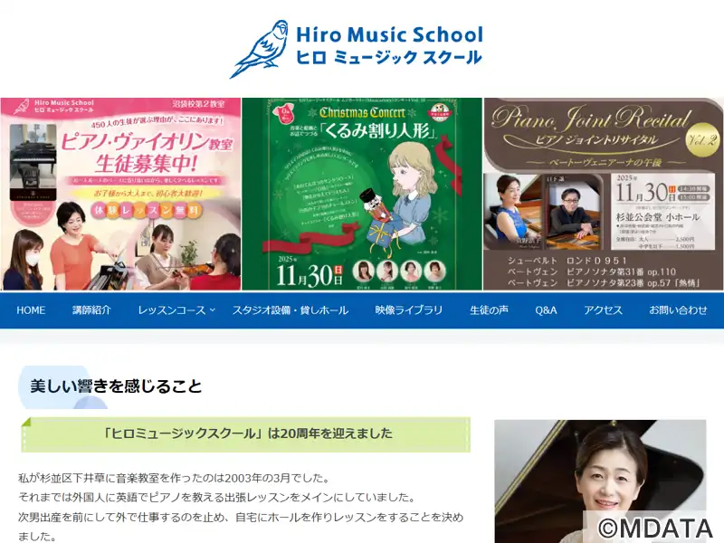 杉並区井荻を拠点に2003年に開校した総合音楽教室。ピアノ、ヴァイオリン、チェロなどの弦楽器、リトミック、英語リトミック、打楽器、フルート、声楽、オカリナクラスを開講。0歳児からのリトミックを始め、年齢や性別を問わず、多くの人々が楽しみながら技術を身につけることができる。プロの演奏家による楽しく、真剣なレッスンで、一人ひとりに合わせた丁寧な指導が特徴。音楽を通じた個性と表現力の育成を目指している。