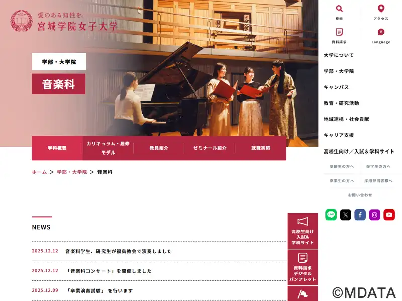 仙台市にある宮城学院女子大学の音楽科。東北で唯一の4年制の音楽科として、幅広い知識と技術を身につけ、音楽の世界を深く学ぶ。実技を中心にアンサンブル、音楽史、音楽理論、教職科目などをバランス良く学べるカリキュラムを用意している。アットホームな環境で、各自の音楽経験に合わせた指導を行う。演奏技術や音楽の専門知識だけでなく、コミュニケーション能力や人間性を磨くための教育、発表会など実践の場も提供する。