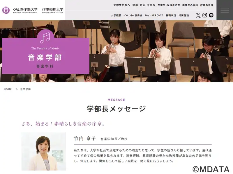 岡山県倉敷市にある私立大学で、音楽、食文化、子ども教育の3分野に特化した教育を掲げる。音楽学部には、音楽学科と音楽教育学科の2学科があり「音楽学科」では、ピアノ、管楽器、弦楽器、声楽などの専門分野を選択して、演奏技術や音楽理論を学ぶ。「音楽教育学科」では、幼児から高校までの音楽教育に必要な知識や技能を身につける。教員は、国内外で活躍する演奏家や作曲家などのプロが担当し、希望者への就職率100%を目指す。