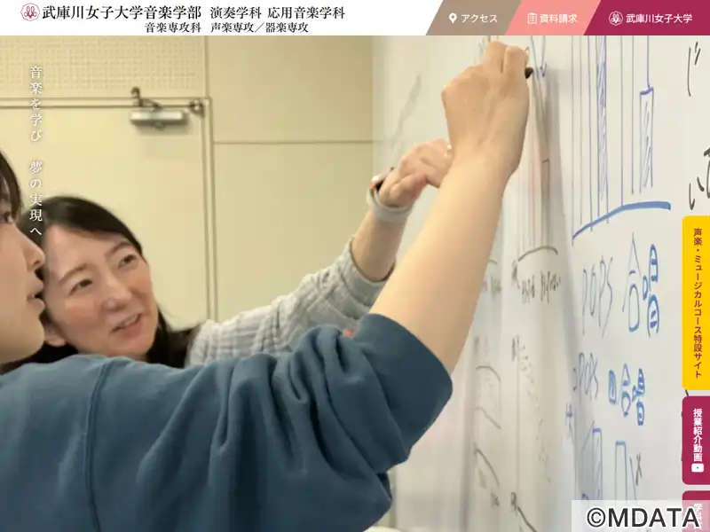 兵庫県西宮市にキャンパスのある、1949年設立の私立武庫川女子大学の音楽学部。学生の個性を重視した指導のもと、豊かな感性と技能を育成。高度な演奏技術と音楽知識を習得しつつ、一般教養と人間性を育む教育を行う。演奏学科と応用音楽学科があり、演奏学科では声楽、ピアノ、弦楽器、木管楽器の専修を、応用音楽学科では音楽療法や音楽活用の専修を提供している。演奏会やコンクール出演など実践の機会も多数用意している。
