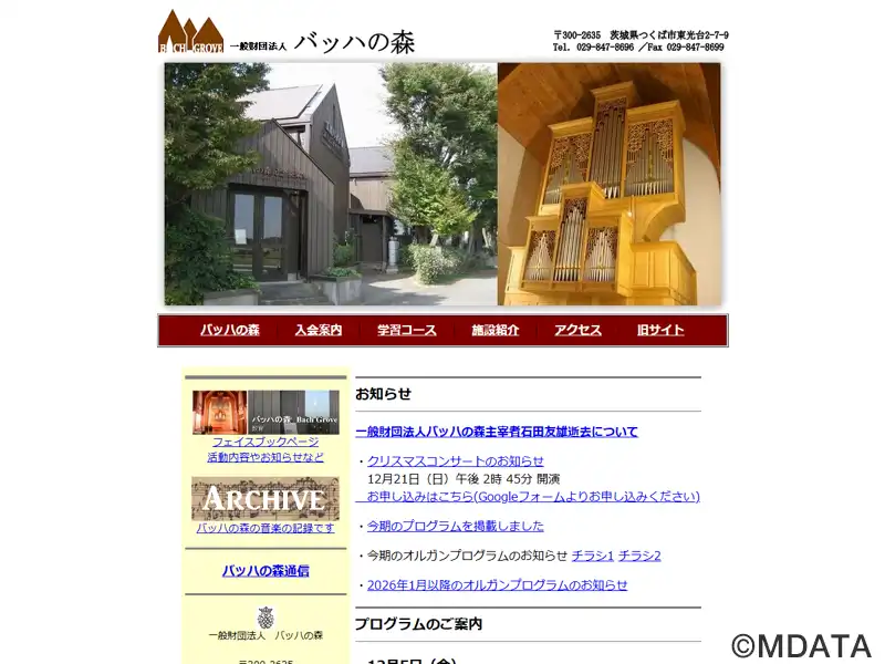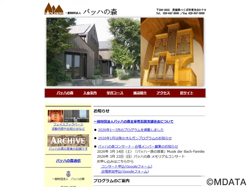 茨城県つくば市にある聖書と教会音楽の総合的な学び舎。1985年、市民有志によって設立され、宗教団体には属さない。クラヴィコードやオルガン、チェンバロ、声楽など多彩な実技教室のほか、コラールやオルガン音楽の研究会、混声合唱やバロック・アンサンブル、ハンドベルクワイアなどの活動を展開。名匠ユルゲン・アーレント製作のパイプオルガンを備えた木の香り漂う空間「バッハの森記念奏楽堂」でのコンサートも開かれる。