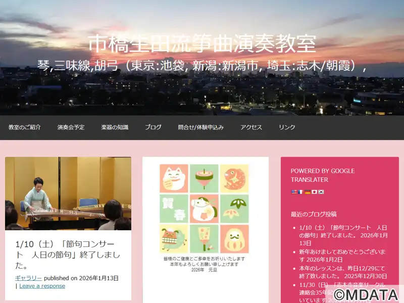 市橋邦楽教室では琴(箏曲)・三味線(三弦)・和胡弓の教室を開講しています。埼玉県志木市・東京都豊島区池袋・新潟市中央区の3ヶ所で展開。いずれの教室も駅から徒歩5分以内で大変便利。東京芸術大学卒の講師が、お子様からご年配まで、初心者からプロを目指す方まで、マンツーマンで懇切丁寧に指導いたします。親子レッスンやふた稽古(琴+三絃)も対応可能です。出張稽古もしています。