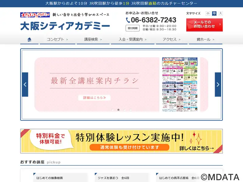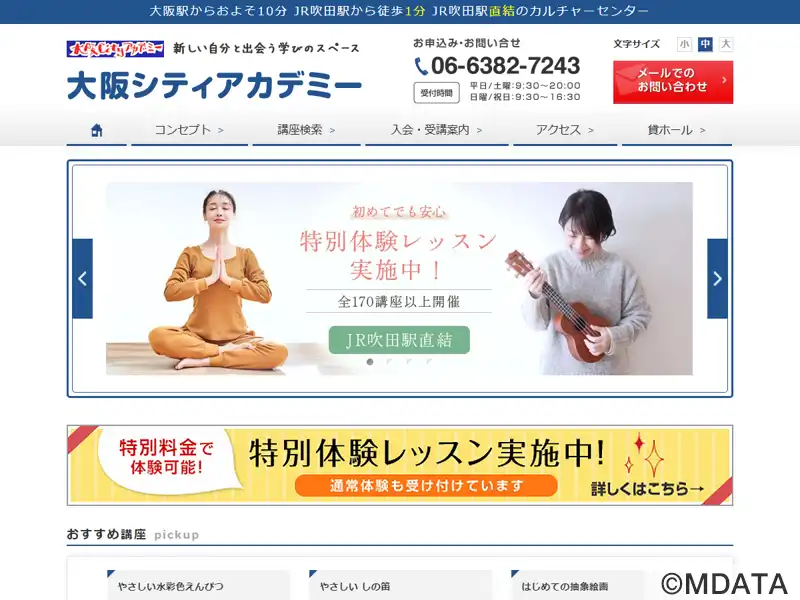 JR吹田駅から徒歩1分のカルチャーセンター。「人生いつだって学び時」のモットーを掲げる、新しい自分と出会う学びのスペース。音楽講座では、フルート・バイオリン、ピアノ、ドラム、しの笛・オカリナ、筝曲・三弦・胡弓・二胡、三味線・三線・大正琴、ギター・ウクレレ、ハーモニカなどのコースを開講する。個別レッスンでは、1人1人のペースに合わせて進めることができ、グループレッスンでは共通の趣味を持つ仲間と出会える。