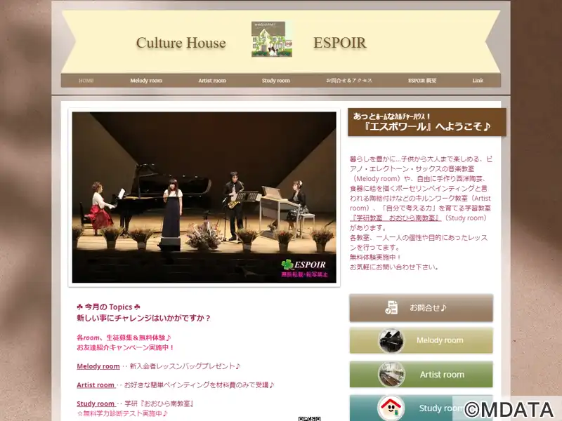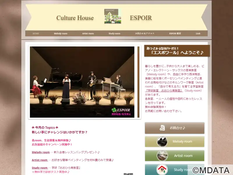 栃木市西水代にある1994年開設のアットホームなカルチャー教室。「Melody room」では、ピアノ・エレクトーン・サックス等のレッスンを開講し、初心者から趣味、専門・音大受験まで幅広いニーズに対応している。また、「Artist room」では、西洋陶絵付けや陶芸を学べるクラスがあり、どの教室も、優秀な講師による個々の目的に合わせた指導が特徴で、子どもからシニア世代まで楽しめる環境が整っている。