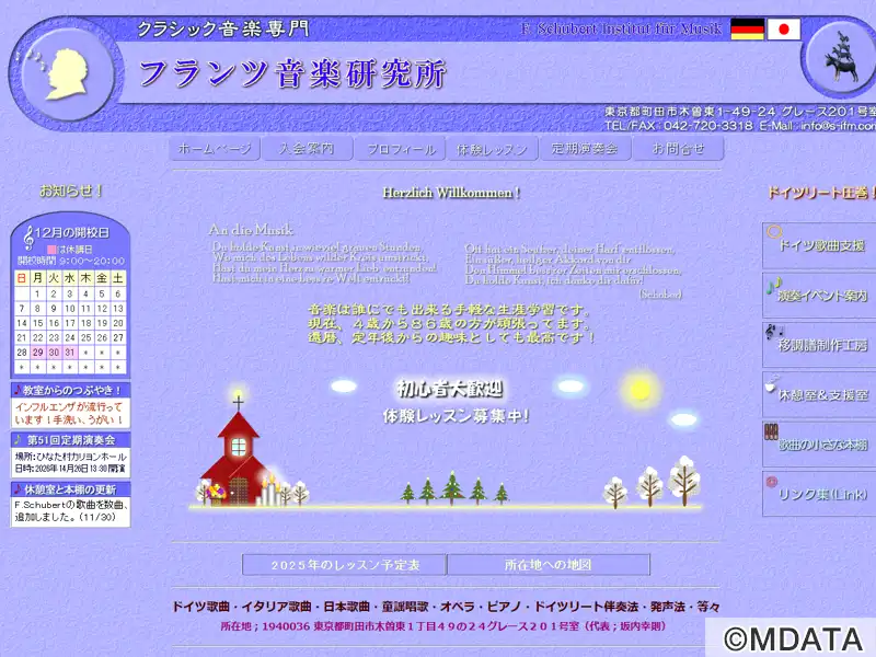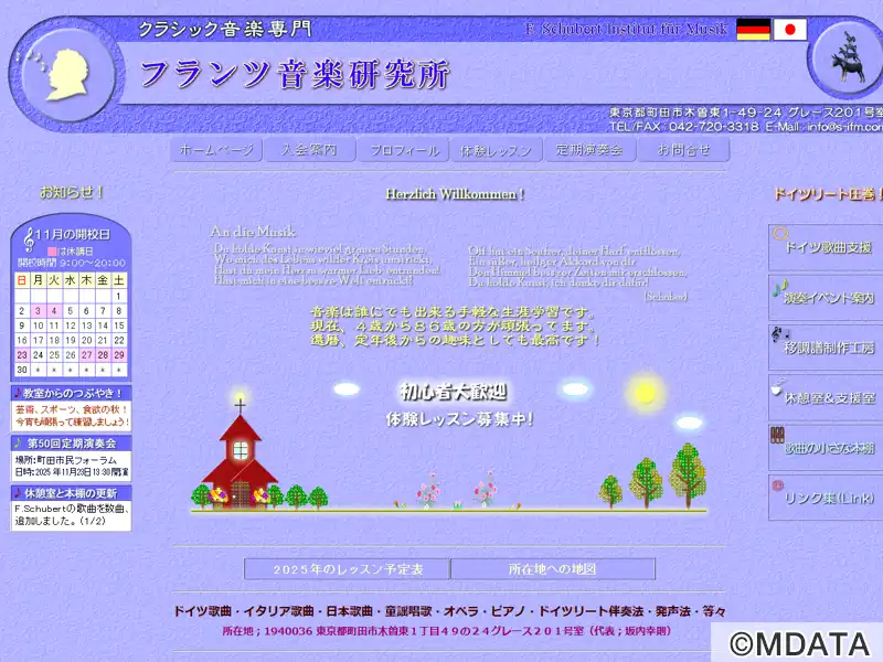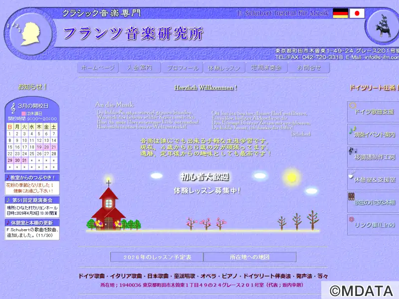 東京都町田市にあるクラシック音楽専門の声楽・ピアノの音楽教室。1996年に創設され、幼児からシニアまで年齢や経験を問わず幅広く受け入れ、各自の習熟度や目標に応じて無理のないペースで学べる。指導内容は、声楽ではドイツ歌曲・イタリア歌曲・日本歌曲・童謡・オペラまで、ピアノではソロ演奏や歌曲伴奏法、室内楽に対応。楽典やソルフェージュといった基礎教育も充実。音大受験対策や専門的に声楽を学びたい方にも対応。