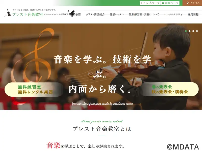 文京区・茗荷谷の春日通り沿いにある音楽教室。弦楽器や木管・金管楽器、ピアノ、チェンバロ、ハープ、クラシックギター、声楽、作曲などの多彩なクラスがあり、基礎から高度なレベルまで、初心者から音大受験まで、丁寧な個人レッスンで、演奏技術と音楽性を学ぶことができる。また、レンタルスタジオとして、本館に8つの個人練習室とグランドピアノ常設のアンサンブルスタジオ、別館にサテライトスタジオ2部屋を設けている。