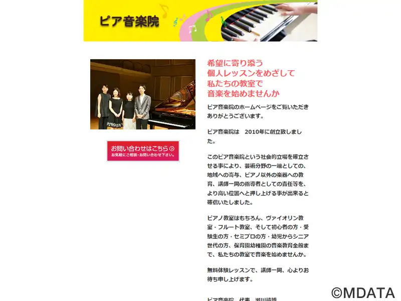 兵庫県姫路市に2010年創立した音楽教室。ピアノを中心に、ヴァイオリンやフルートのレッスンを提供。幼児からシニア世代まで幅広い年齢層を対象とする。ピティナ・ピアノコンペティションや兵庫県学生ピアノコンクールなど、多くのコンクールで生徒の受賞歴があり、音楽大学や音楽高校の受験指導にも力を入れる。講師陣は音楽大学卒で、高い演奏能力と豊富な指導経験を持ち、生徒一人ひとりに合わせた個別レッスンを行っている。
