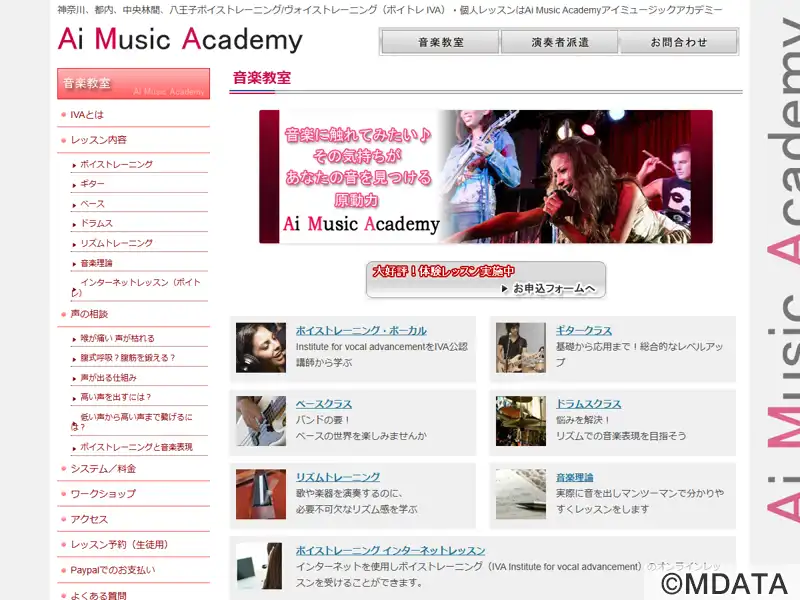 東京八王子市子安町にあるボーカル&音楽トレーニングスタジオ。IVA認定インストラクターが科学的発声法を指導。個人レッスンでは発声の基礎、息のコントロール、声の響きを強化し、高音や声の裏返り改善に特化。グループレッスンではハーモニーやアンサンブル技術を習得。ボーカル、ギター、ベース、ドラム、音楽理論、リズムトレーニングをフレックス制で提供。完全オーダーメイドで録音復習対応。趣味からプロ志向まで対応。