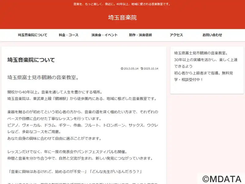 埼玉県富士見市鶴瀬にある音楽教室。30年以上の歴史を持ち、地域に根ざして幼児から大人まで、初心者から上級者まで幅広く対応する。ピアノ、声楽、ドラム、ギター、作曲など多彩なコースを設け、段階的なカリキュラム(本科、マスターコース、カルチャーコース、受験科)で着実な上達をサポート。アットホームな雰囲気と丁寧な指導が特徴で、学院祭や演奏会など発表の機会も充実。音楽を楽しみながら学べる環境が整っている。