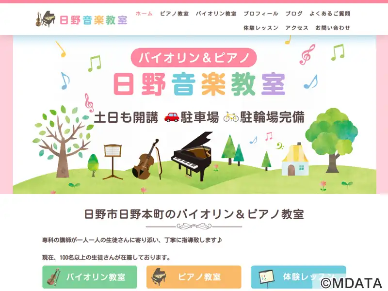 東京都日野市にある地域密着型のバイオリン&ピアノ教室。ピアノとバイオリンを中心に、100名以上の生徒が通う。初心者から上級者まで幅広く対応し、専科のプロ講師による丁寧なレッスンが特徴。子どもから大人まで、それぞれの目的やペースに合わせた指導が受けられる。グランドピアノを備え、本格的な演奏環境が整う。ピアノとバイオリンの両方を学べるコースや、聴音・ソルフェージュなど、要望に応じた柔軟なレッスンが可能。