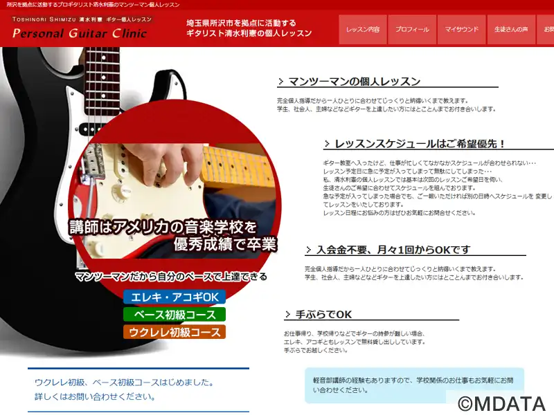 所沢市にあるギター教室で、生徒の個々のニーズに合わせたマンツーマンレッスンを行う。ロック、ジャズ、フュージョン、ファンク、ボサノヴァ、R&Bなど幅広いジャンルに対応し、音楽理論、作曲、編曲、DTMなども実践しながらの解説や、ウクレレやベースの初級コースも開講している。インストラクターは、国内外の著名な音楽学校を卒業したギタリストの清水利憲氏で、ギターメンテナンスや機材に関する相談などにも対応する。