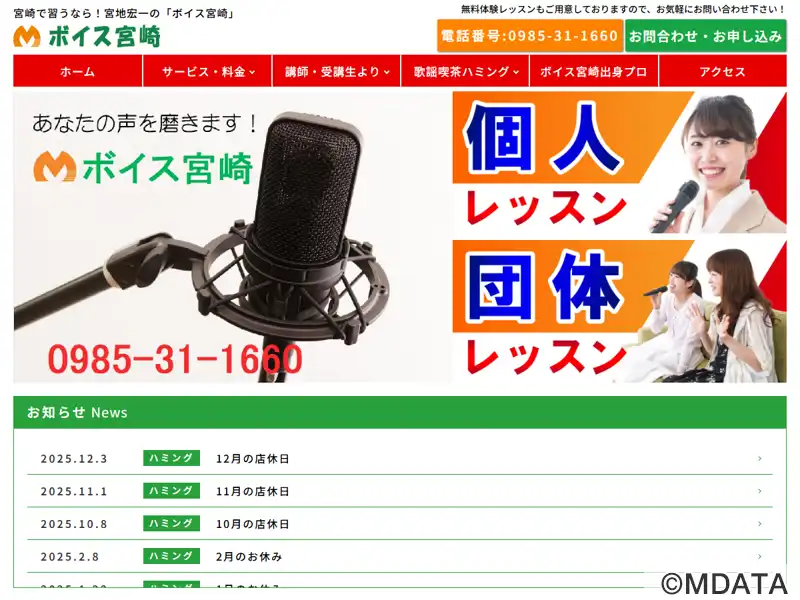 宮崎市の中心街に位置している教室です。旧名称ヴォイス・トレーナーズ・アカデミー 宮崎中央校。わかりやすい授業であなたの声を磨いていきます。歌うことの大好きな方や、声をご職業にされている方、プロを目指している方など、ジュニアからシニアまで幅広く指導しています。voiceコースとvocalコース、月1回コースから月4回コースなどご希望のコースに選択できます。